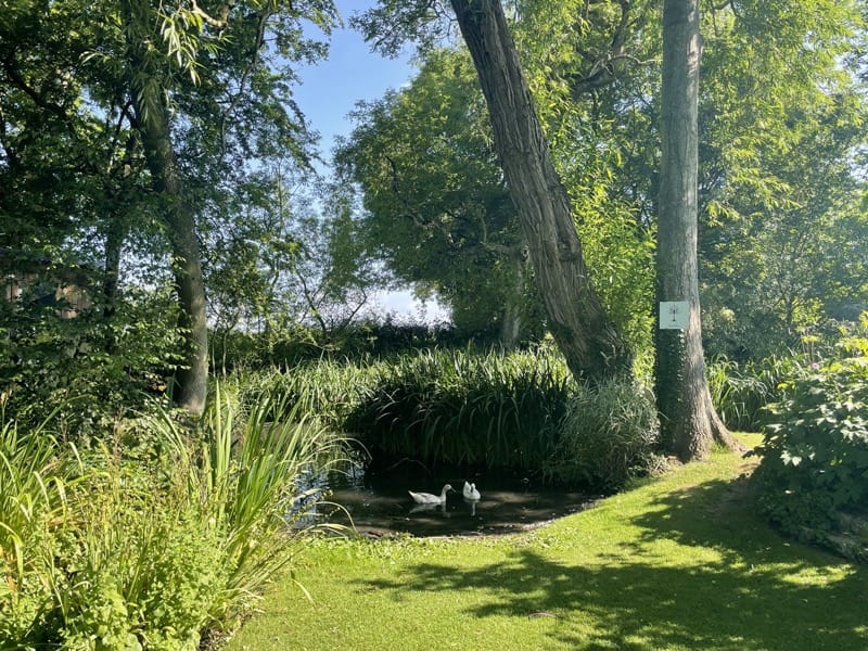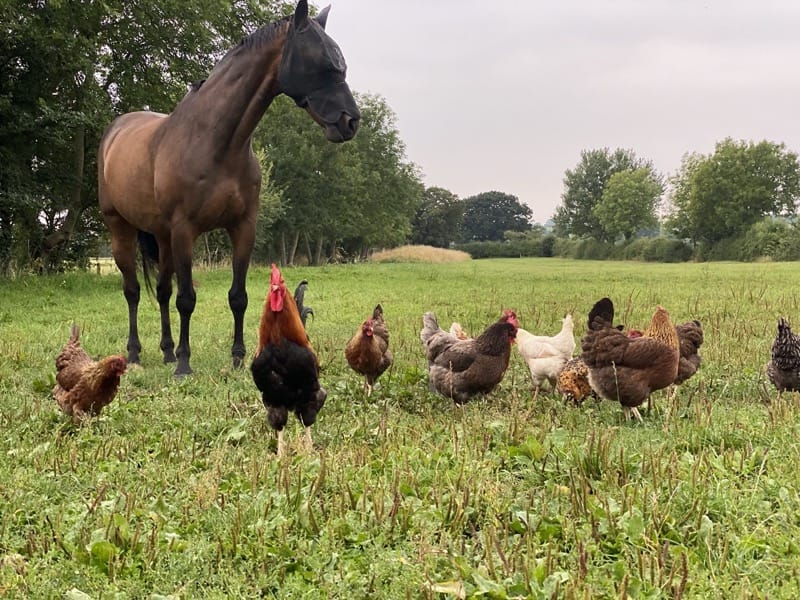 The pond has moorhens, ducks and occasionally a predatory Heron. There are frogs, toads and the occasional grass snake if you are quiet and lucky enough. They have horses in the fields and cows and sheep graze in the fields around the orchard.